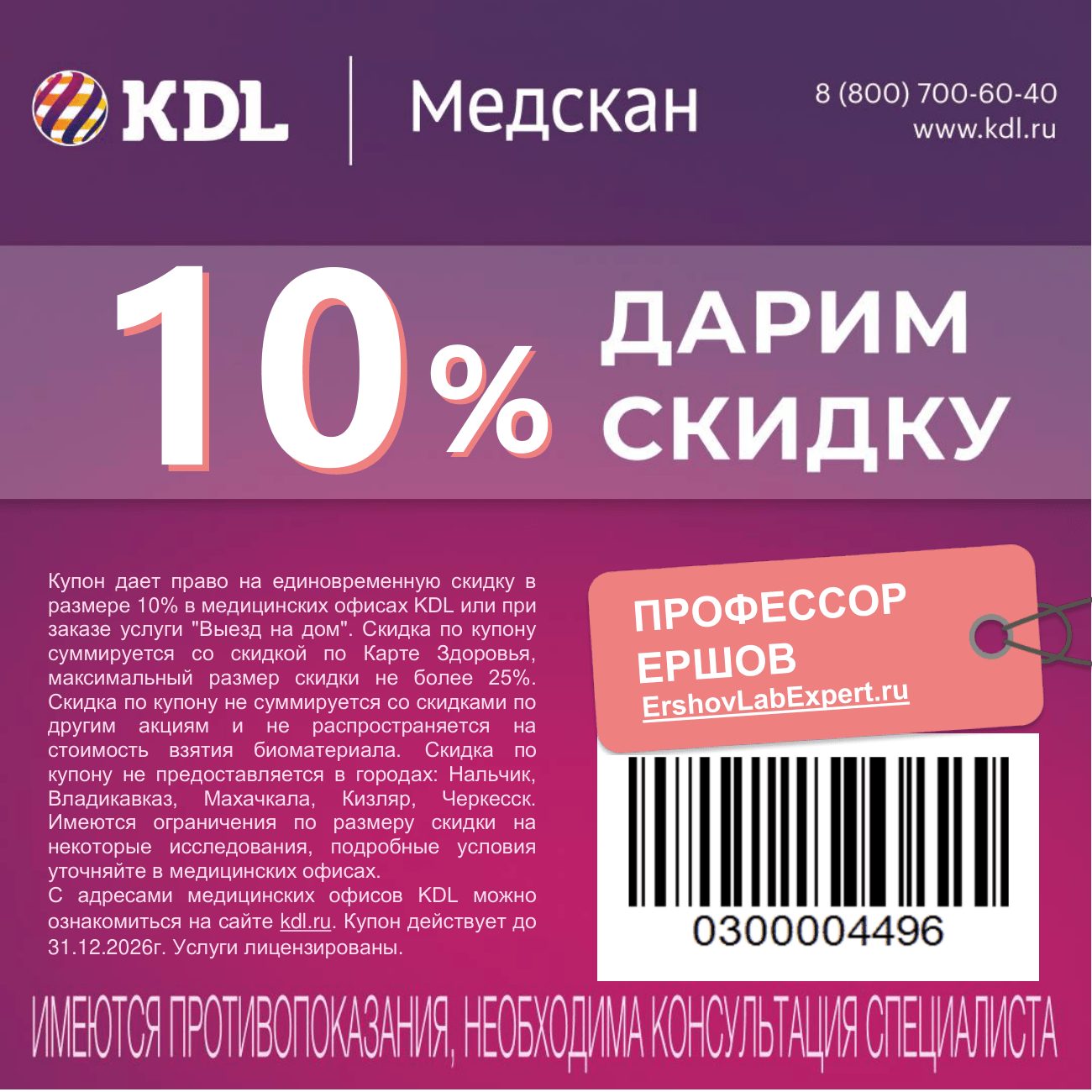 В KDL по штрих-коду (необходимо показать штрих-код администратору) «0300004496» (сказать администратору, чтобы ввел цифрами, если не сработает штрих-код) к Вашей персональной скидке приплюсуется еще 5% скидки. Результаты от KDL Вы можете БЕСПЛАТНО отправлять мне на интерпретацию и назначения через ресурсы сайта!